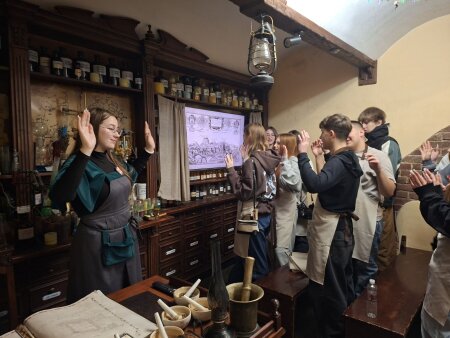 Але найцікавіше нас звісно ж чекало у таємній лабораторії у підземеллі. Тут ми змогли послухати львівські легенди про перших фармацевтів у місті, побачити наукові експерименти та побувати на уроках таємного аптекаря. Крім того, мали можливість придбати оригінальні сувеніри у вигляді «пігулок для щастя» або «ліків від лінощів».