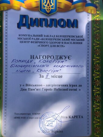 15 квітня відбувся другий етап «Військово-патріотичних ігр», присвячених Дню Памʼяті Героїв Небесної Сотні, на яких збірна команда Білоцерківського академічного ліцею «Колегіум» посіла почесне 2 місце.